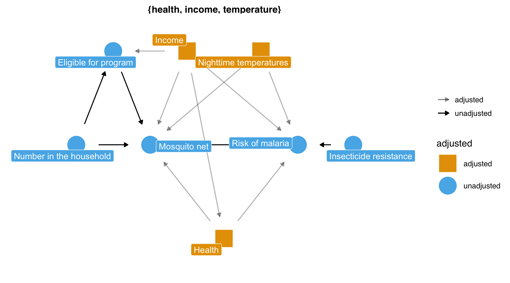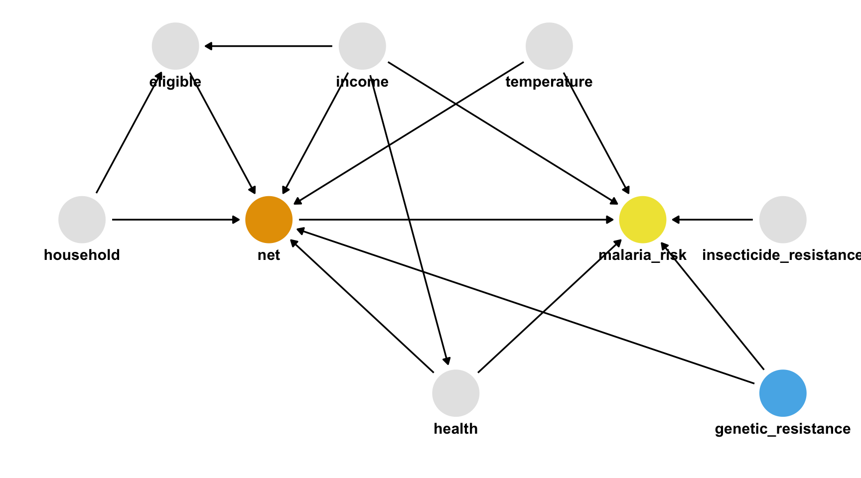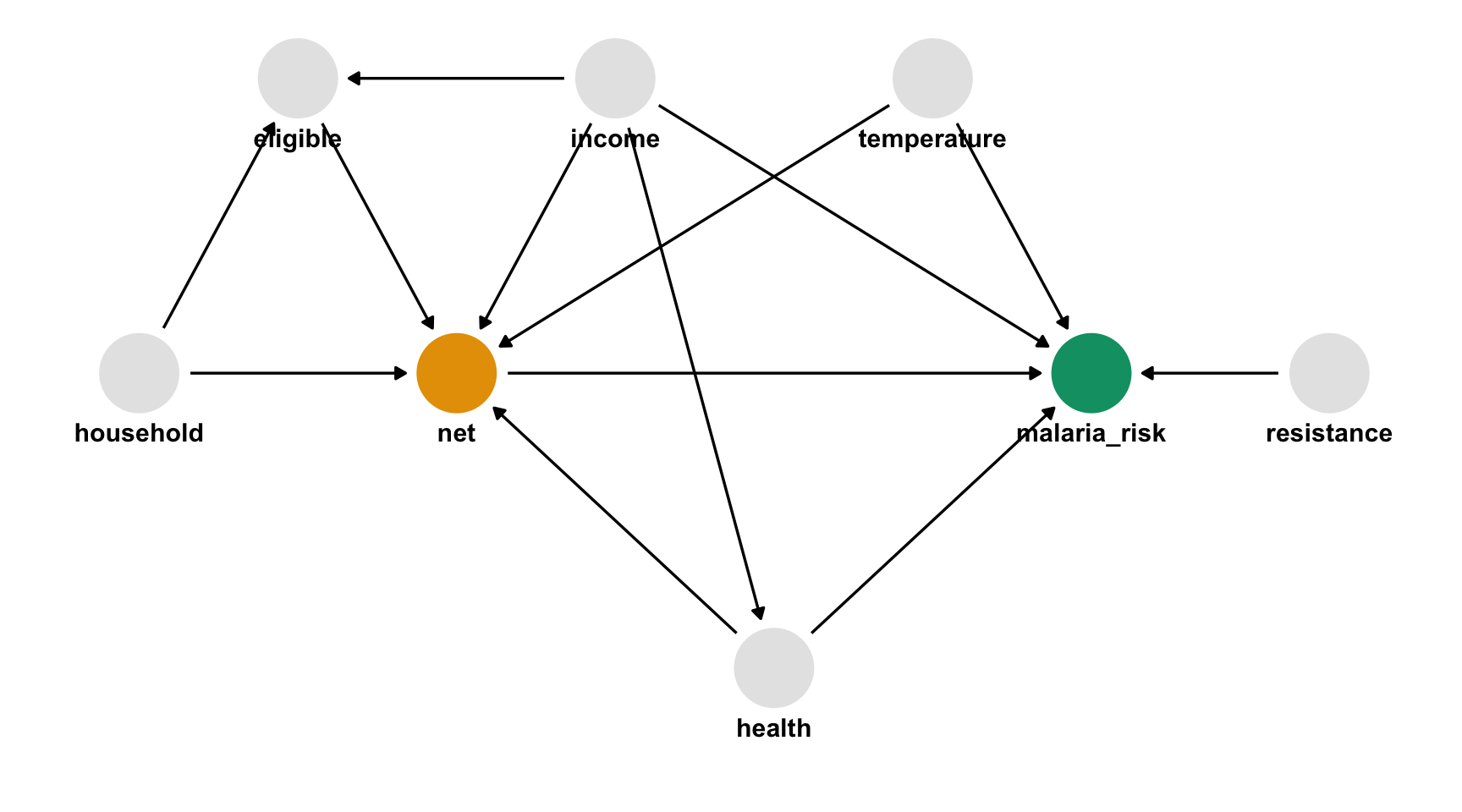 researchers are interested in whether using mosquito nets decreases an individual’s risk of contracting malaria. They have collected data from 1,752 households in an unnamed country and have variables related to environmental factors, individual health, and household characteristics. The data is not experimental—researchers have no control over who uses mosquito nets, and individual households make their own choices over whether to apply for free nets or buy their own nets, as well as whether they use the nets if they have them.